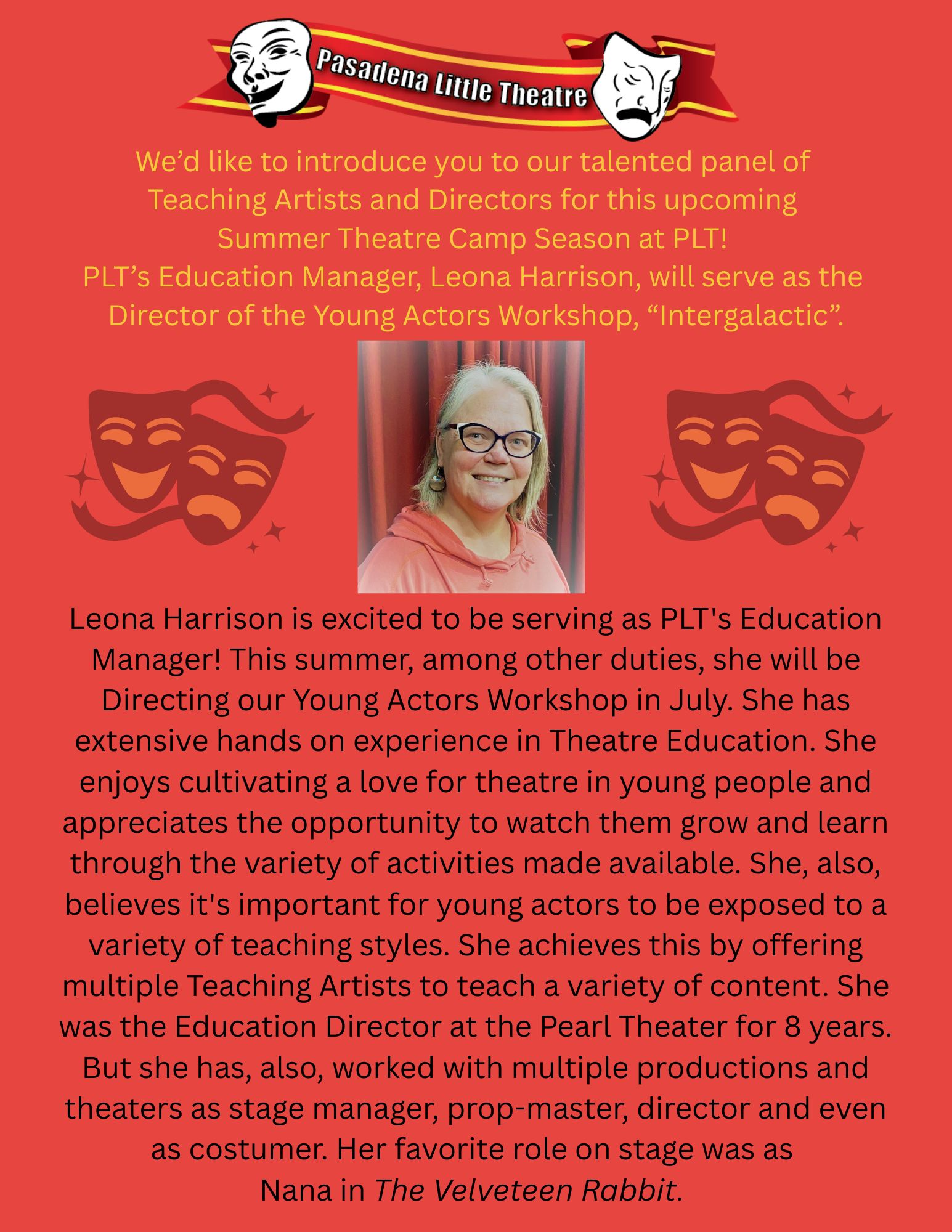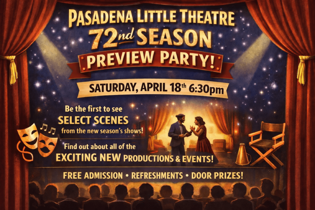 Pasadena Little Theatre is soliciting Directors for our 72nd Season (June 2026 – May 2027). We are asking Directors to submit their favorite plays for consideration.